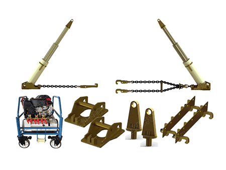 一、技术特点地铁液压救援起复设备主要部件选用铝合金制造,重量轻、产品结构成熟、性能质量稳定可靠,适用于各种线路,多种复杂救援工况,设备能达到快速安全复位,特别在大型起重机无法作业的地方,更能体现其设备的优越性。油缸的进出油口设有安全液压锁,防止油缸在工作过程中由于液压系统瞬间泄漏导致油缸下降。二、适用范围适用于地铁的救援起复作业。三、设备组成设备主要由汽油机为动力源的超高压液压泵站、三级油缸、高压胶管、油缸帽、底座、车辆索具等组成。四、技术参数型 号:FX-CY侧移复位装置:使用范围广,可用于起复车体两侧架车配合三级起复设备使用;同时满足曲线超高复位使用;还可以用两支油缸顶车体两侧顶点位置起升复位,完全满足CRH各种车型一端救援起复作业。机动泵站:汽油机(进口)与液压油箱采用立轴式连接,功率10.5PS、流量5.5L、 储油量26L、压力42MPa;泵站小车把手长度≥200mm ;泵站小车配万向轮。铝合金二级油缸:自由高度600mm、一级行程414mm、二级行程426mm、一级推力65t、二级推力30t 。 二级油缸镐帽:φ85×12mm、φ80×62mm;二级油缸顶托:适用于CRH1、CRH2、CRH380、CRH5型动车组。二级油缸底座:390×280×132mm 。链条卡具:φ14×42 L=2.2m 最小破断拉力:246KN。钢轨连接器:长度1700mm 载荷246KN 。轮对止脱器:1000×140×46mm、卡钩175×88×30mm。