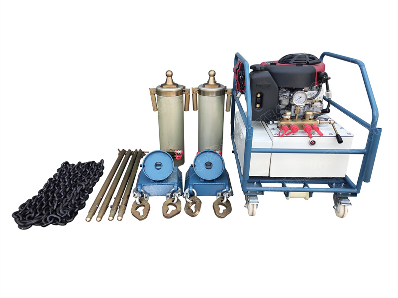 一、技术特点地铁液压救援起复设备主要部件选用铝合金制造,重量轻、产品结构成熟、性能质量稳定可靠,适用于各种线路,多种复杂救援工况,设备能达到快速安全复位,特别在大型起重机无法作业的地方,更能体现其设备的优越性。油缸的进出油口设有安全液压锁,防止油缸在工作过程中由于液压系统瞬间泄漏导致油缸下降。二、适用范围适用于地铁的救援起复作业。三、设备组成设备主要由汽油机为动力源的超高压液压泵站、三级油缸、高压胶管、油缸帽、底座、车辆索具等组成。四、技术参数型 号:FX-CY侧移复位装置:使用范围广,可用于起复车体两侧架车配合三级起复设备使用;同时满足曲线超高复位使用;还可以用两支油缸顶车体两侧顶点位置起升复位,完全满足CRH各种车型一端救援起复作业。机动泵站:汽油机(进口)与液压油箱采用立轴式连接,功率10.5PS、流量5.5L、 储油量26L、压力42MPa;泵站小车把手长度≥200mm ;泵站小车配万向轮。铝合金二级油缸:自由高度600mm、一级行程414mm、二级行程426mm、一级推力65t、二级推力30t 。 二级油缸镐帽:φ85×12mm、φ80×62mm;二级油缸顶托:适用于CRH1、CRH2、CRH380、CRH5型动车组。二级油缸底座:390×280×132mm 。链条卡具:φ14×42 L=2.2m 最小破断拉力:246KN。钢轨连接器:长度1700mm 载荷246KN 。轮对止脱器:1000×140×46mm、卡钩175×88×30mm。
