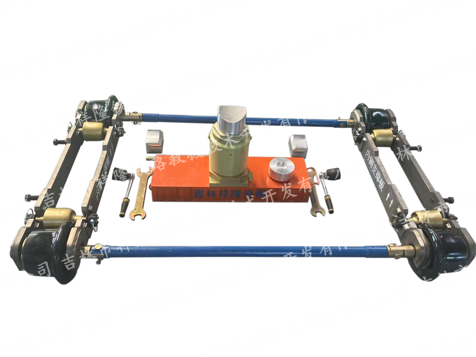 一、技术特点 通用性强、重量轻、体积小,组装方便快捷。主要由走行轮、轮托、内和外支撑板、连接杆及穿销、紧定螺栓、紧固螺母等组成。二、适用范围 适用于地铁、城市轨道交通、轨道车、供电作业车、多功能作业车等轮对出现故障等问题影响运行时,用该抬轮器将故障轮对抬起,并由其当作临时承载,在限定的速度内使机车或车辆恢复运行,起到应急救援作用。三、技术参数1、最大运行速度:30km/h,其中道岔为25km/h2、最大载重: 100KN/侧(两侧200KN)3、抬轮的高度: 18-23mm4、固定轴距: 750mm5、适用车轮滚动圆直径:790-850mm6、允许通过最小曲线半径≥150米7、外形尺寸:1770×910×160mm8、重量/台: 净110kg9、油压千斤顶 : 起重力310kN(32吨)、行程 l30mm、高度 240mm