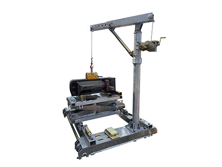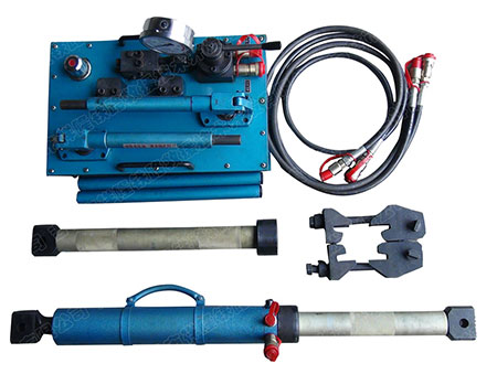 一、适用范围 该缓冲器综合压缩装置用于在线路上对货车车辆车钩及其缓冲器的应急更换作业,适用于C64、C70、C80型车辆车钩缓冲装置在作业线路上的快速更换作业。二、技术参数手动泵:工作压力52Mpa ,低压排量92ml/次 ,高压排量12ml/次。主推油缸:推力40t ,自由高度95mm,工作行程30mm ,额定压力52Mpa。钩框挤压油缸:推力40t,自由高度120mm,工作行程23mm,额定压力52Mpa 。液压升降台:允许起升重量500kg,自由高度300,起升行程600,升降台可调角度0-6°,最大外形尺寸1200×520×300。摇臂机械吊:固定高度1765,悬臂长900,可自由旋转。额定起吊500kg。磁力吸盘:额定吸附能力力500kg ,重量约10kg。